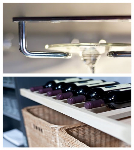 verchromte Glashalter zum Einschieben von Weingläsern, montiert unter dem Oberboden.
