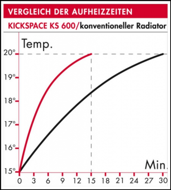 Im Leistungsvergleich mit einem konventionellen Radiator zeigt sich, dass ein KICKSPACE Aggregat nur etwa die Hälfte der Zeit benötigt um einen ca. 12 m² grossen Raum von 15° C Ausgangstemperatur auf 20 ° C Raumtemperatur aufzuheizen.