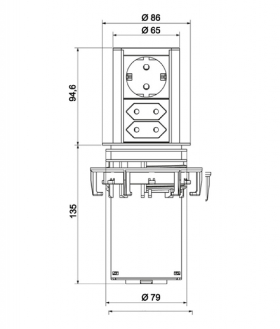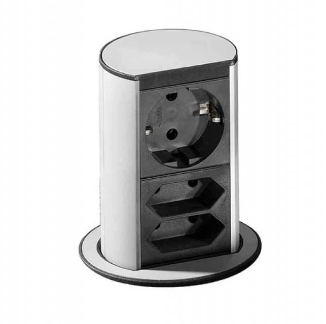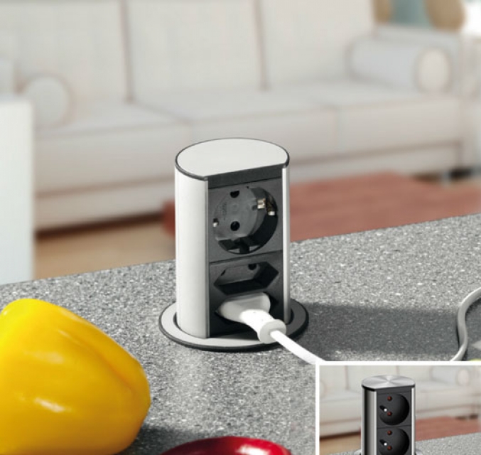 • Steckdosenelement, versenkbar. Mit 3 Steckdosen (1x Schuko, 2x Euroflach) für Hängeschränke oder Arbeitsplatten.
