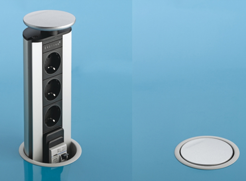 Energiebox. Versenkbar. Mit 3 Steckdosen 45° besonders für Kochinseln geeignet. Leichtführendes Herausziehen durch eine leicht zu drückende Taste, die auch beim Wiederverschließen die Leitung geordnet führt. FI-Schutzschalter