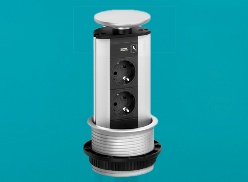 • Energiebox. Versenkbar. Mit 2 Steckdosen und 1 USB Charger (Ladestation) für Hängeschränke oder Arbeitsplatten.