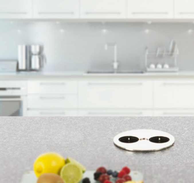 • die Doppelsteckdose eignet sich für den Einbau in Küchenarbeitsplatten aus Holz, Schichstoff, Naturstein oder Glas.