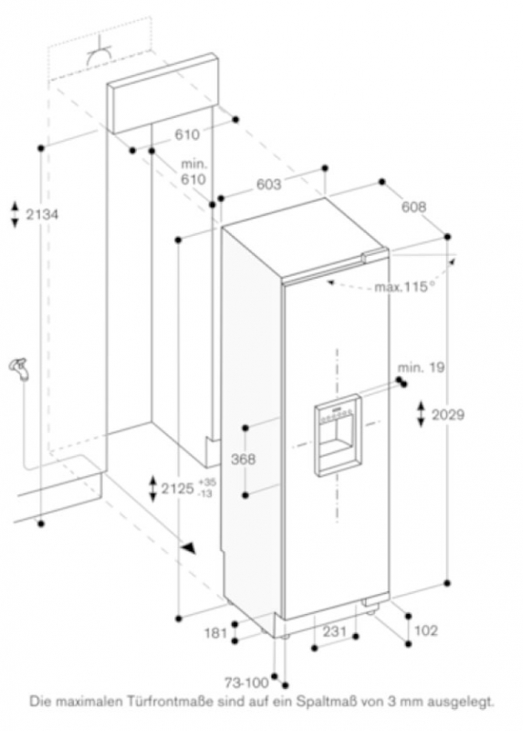 - Absperrventil für Wasseranschluss muss seitlich neben dem Gerät geplant werden und immer zugänglich sein