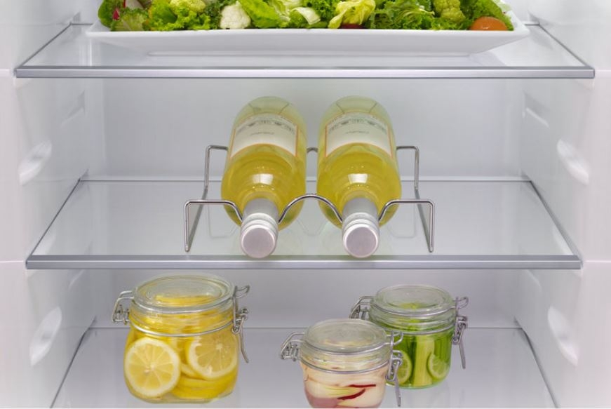 Mit dem praktischen herausnehmbaren Flaschenregal aus Edelstahl lagern Sie Ihre Lieblingsgetränke besonders platzsparend im Kühlschrank.