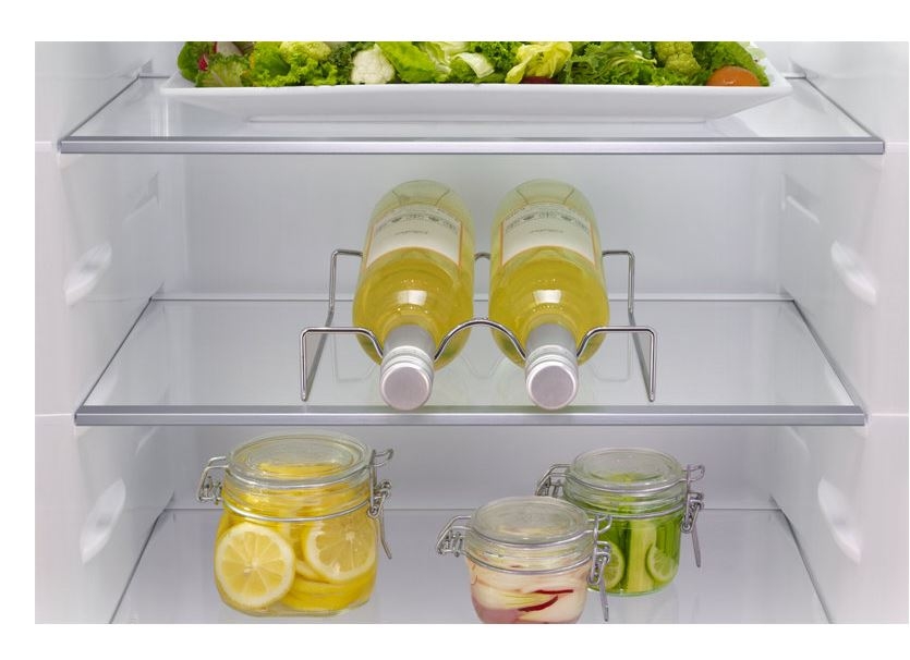 Mit dem praktischen herausnehmbaren Flaschenregal aus Edelstahl lagern Sie Ihre Lieblingsgetränke besonders platzsparend im Kühlschrank.
