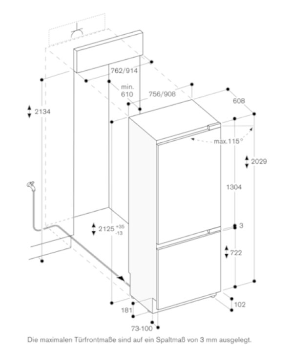 - Absperrventil für Wasseranschluss muss seitlich neben dem Gerät geplant werden und immer zugänglich sein.