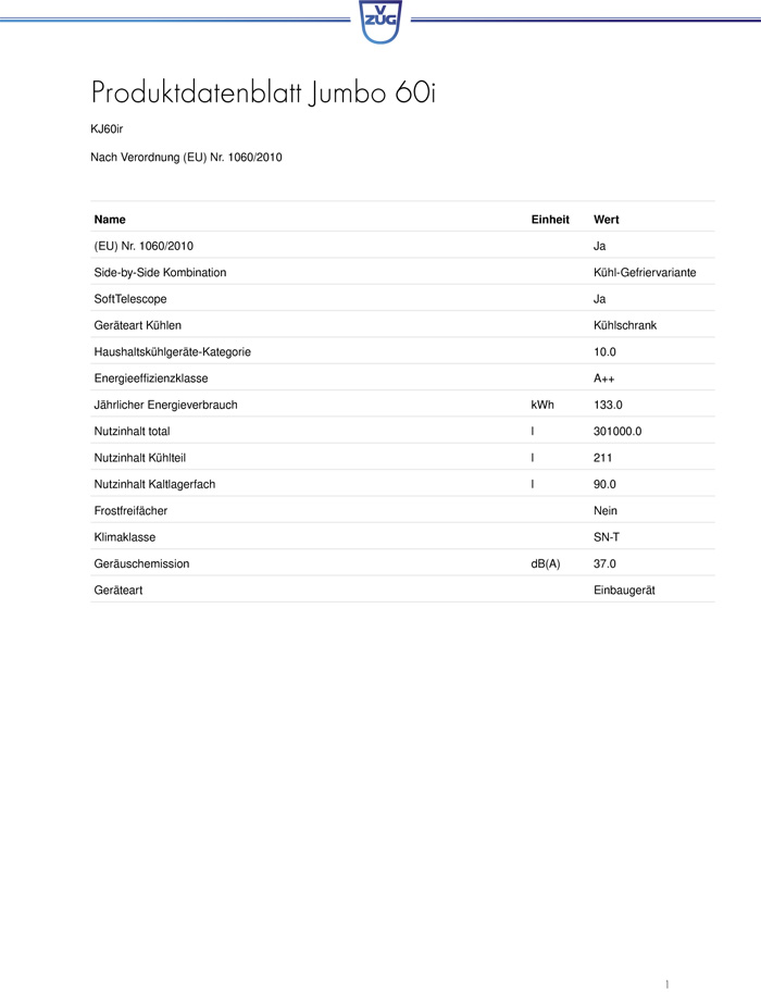 VZug Jumbo 60 I, Einbau-Kühl-Gerät, KJ60ir, 5107860015