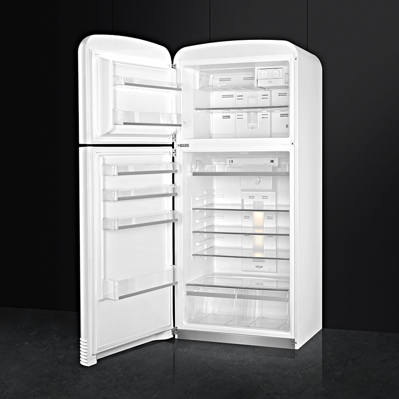 Der SMEG FAB50LPG ist ein Retro Stand Kühl-Gefrierkombi mit einer Höhe von 187,5 cm. Er verfügt über eine bombierte 50er Jahre-Style-Türfront und ein ventiliertes Multiflow-Kühlsystem, sowie eine Life Plus 0°C – Zone und eine Schnellgefrierbox.