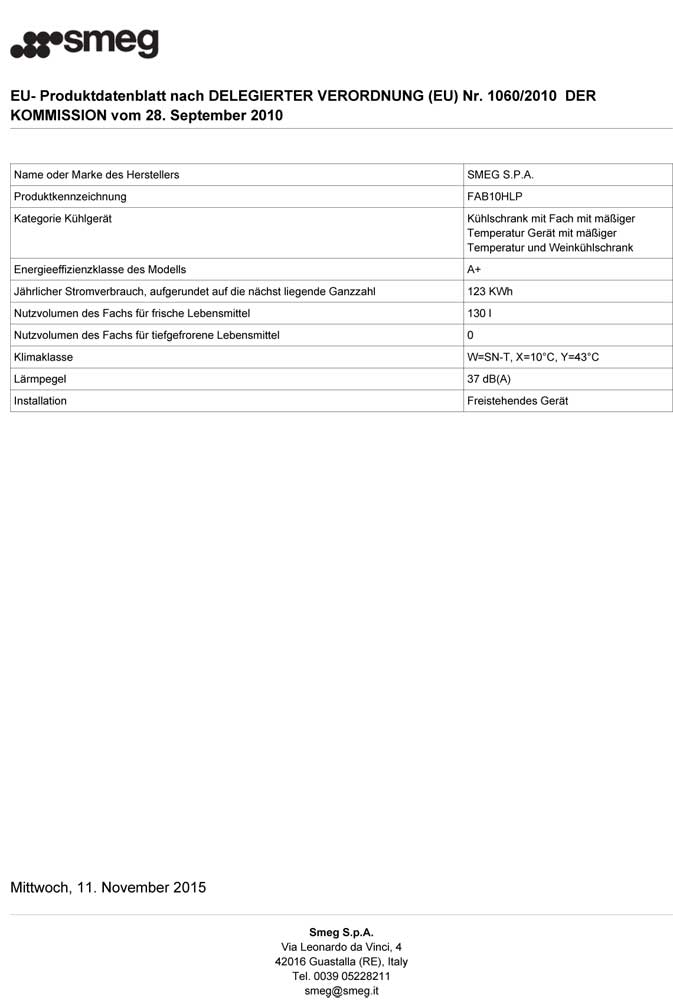 Technische Daten des Smeg Retro-Stand-Kühl-Geräts FAB1 0HLP: