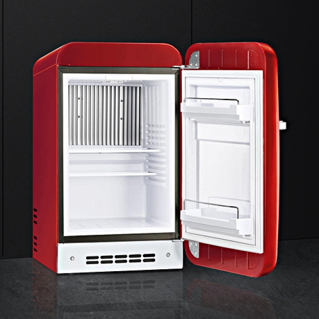 Der SMEG FAB5LRD ist ein Retro Stand Kühlschrank mit Absorber-Kühlsystem. Dieses ist Vibration-und geräuschlos. Er verfügt u. a. über eine bombierte 50er Jahre-Style-Türfront und 2 Sicherheitsglasabstellflächen.