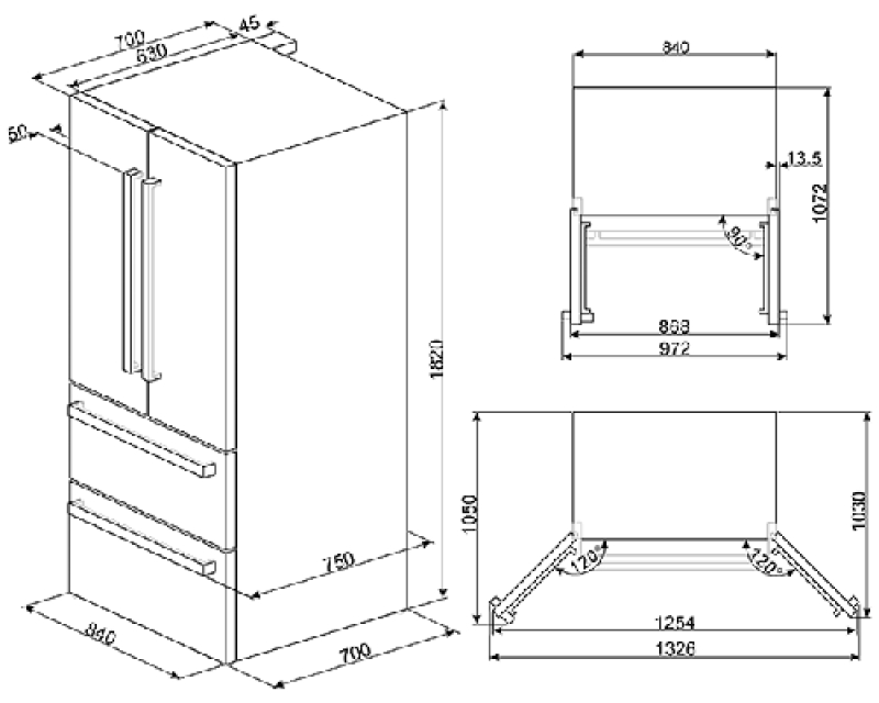 • Abmessungen (HxBxT):1820 x 840 x 700 (Tiefe inkl. Türgriff 750 mm) - bitte Maßzeichung beachten!