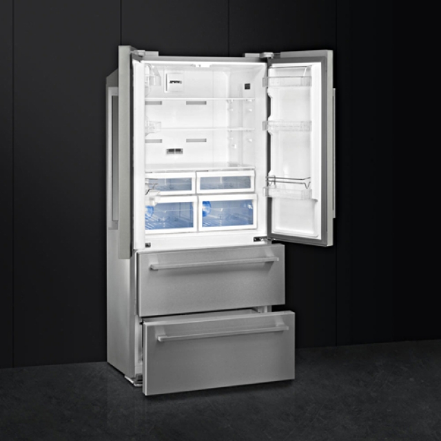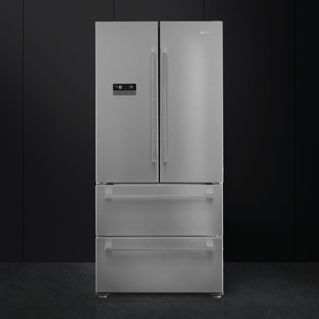 Der SMEG  FQ 55FX2 PE  ist eine Doppeltür- Kühl-Gefrierkombi mit einer Breite von 84 cm.  Sie verfügt u.a. über 100% No-Frost-Technik, ein Soft Touch Display, Active Fresh Blue Light und die Funktionen Eco und Holiday.