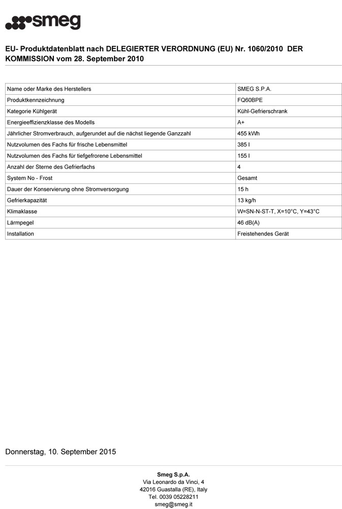 Technische Daten der Smeg Kühl-Gefrier-Side By Side Kombi FQ60 BPE: