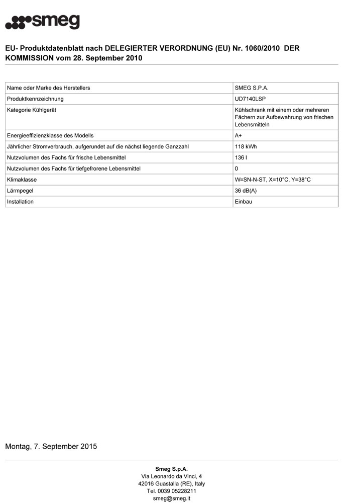 Technische Daten des Smeg Unterbau-Kühlschrank UD71 40LSP: