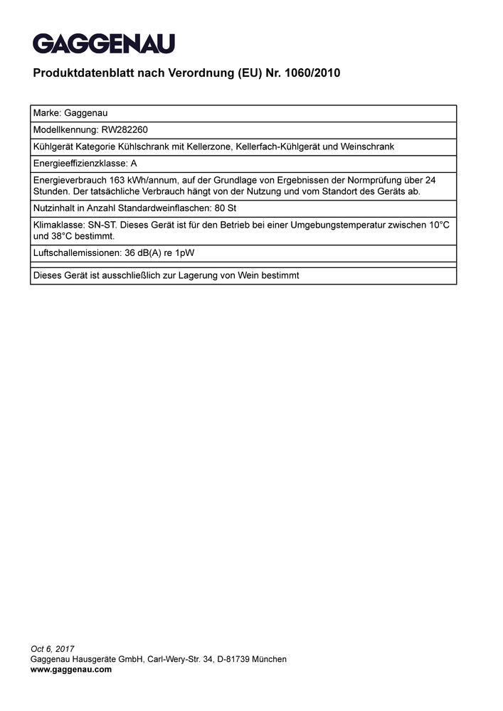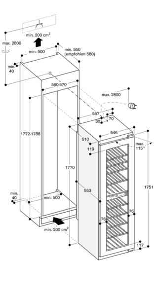 - Bei Kombination des Weinklimaschrankes mit anderen Kältegeräten als einem zweiten Weinklimaschrank, müssen diese eine Seitenwandheizung haben, um Kondensation zu vermeiden. Ohne eine Seitenwandheizung muss ein Mindestabstand von 150 mm zwischen den Geräten eingehalten werden