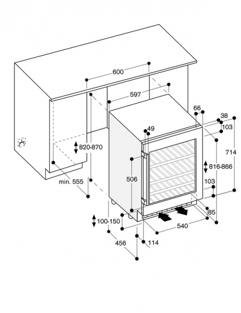 - Bei Integration neben einer seitlichen Wand einen Abstand scharnierseitig von 150 mm vorsehen