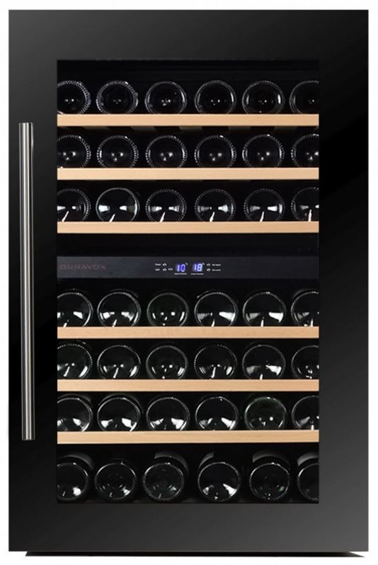 Zwei-Zonen Kompressor-Weinkühlschrank aus der Dunavox Exklusiv-Serie. Flaschen können längsseitig auf die vorhandenden Holzböden gelegt werden. Dieses Gerät ist ein reines Einbaugerät und kann somit nicht als freistehendes Modell verwendet werden.