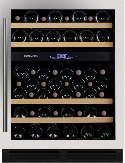 Zwei-Zonen Weinkühlschrank aus der Dunavox Exklusiv-Serie. Durch das elegante Erscheinungsbild mit Edelstahl (INOX) und Edelstahltürgriff ist dieser Einbau-Weinkühler ein Highlight für die moderne Küche.