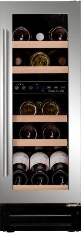 Ein-Zonen Weinkühlschrank aus der Dunavox Exklusiv-Serie. Durch das elegante Erscheinungsbild mit schwarzem Stahltürrahmen und Edelstahltürgriff ist dieser Einbau-Weinkühler ein Highlight für die moderne Küche.