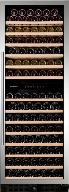 Exklusives Weinklimagerät mit zwei Zonen aus der Dunavox Exklusiv-Serie. Durch das elegante Erscheinungsbild mit Edelstahl (INOX) Stahltürrahmen und Edelstahltürgriff ist dieser Einbau-Weinkühler ein Highlight für die moderne Küche.