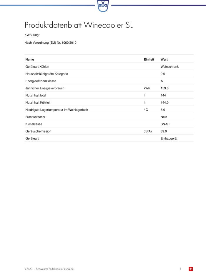 VZug Winecooler SL60, Wein-Kühlschrank, KWSL60GR, 5107560012