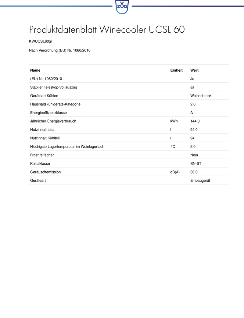 VZug Winecooler UCSL60, Wein-Kühlschrank, KWUCSL60GR, 5107360012