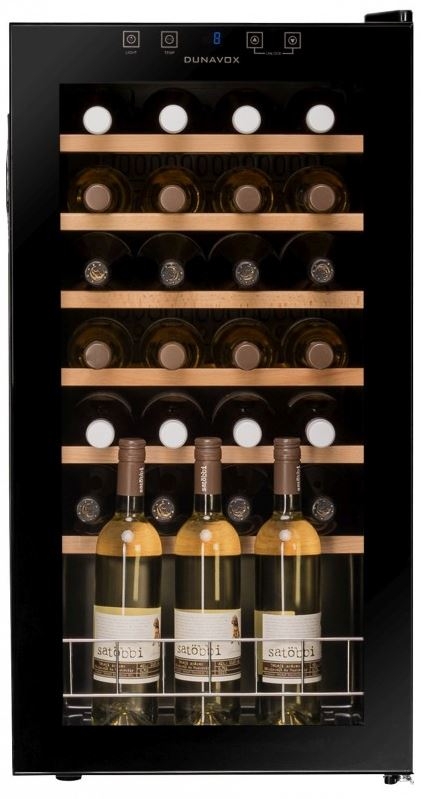 Kompressormodell-Weinkühlschrank aus der Dunavox Serie. Dieses Modell wird zusätzlich mit einem Präsentationsboden und mit normalen Metalleinlegeböden geliefert.