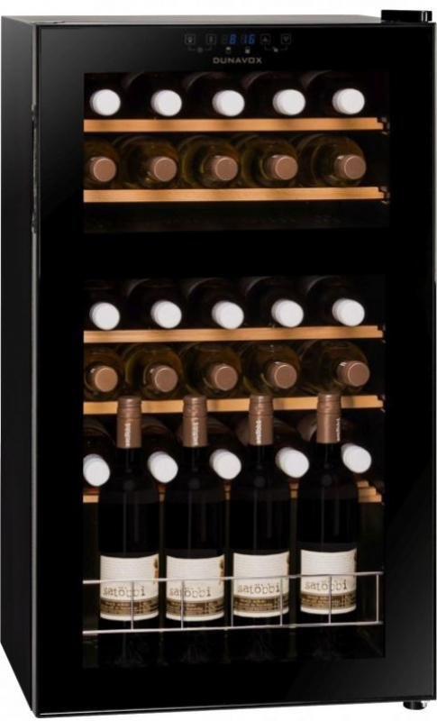 Zweizonen Kompressor Weinkühlschrank für Rot- und Weißwein. Flaschen liegen auf ausziehbaren Holzeinlegeböden. Maximal kann dieses Gerät 30 Flaschen lagern! Die Temperaturdifferenz zwischen den beiden Zonen darf 6 °C nicht überschreiten!