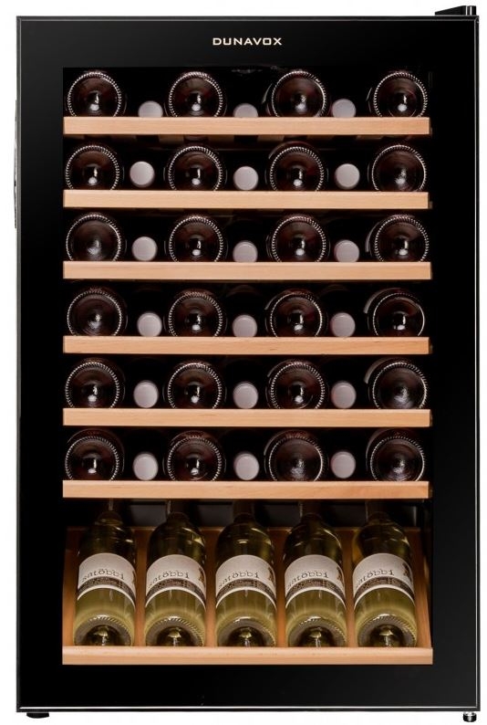 Kompressormodell-Weinkühlschrank aus der Dunavox Serie. Dieses Modell wird zusätzlich mit einem Präsentationsboden und mit normalen Metalleinlegeböden geliefert.