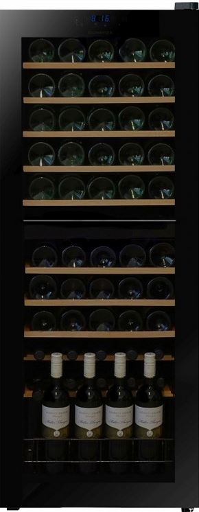 Zweizonen Kompressor Weinkühlschrank für Rot- und Weißwein. Flaschen liegen auf ausziehbaren Holzeinlegeböden.