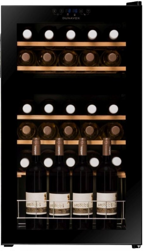 Zweizonen Kompressor Weinkühlschrank für Rot- und Weißwein. Flaschen liegen auf ausziehbaren Holzeinlegeböden. Maximal kann dieses Gerät 30 Flaschen lagern! Die Temperaturdifferenz zwischen den beiden Zonen darf 6 °C nicht überschreiten!