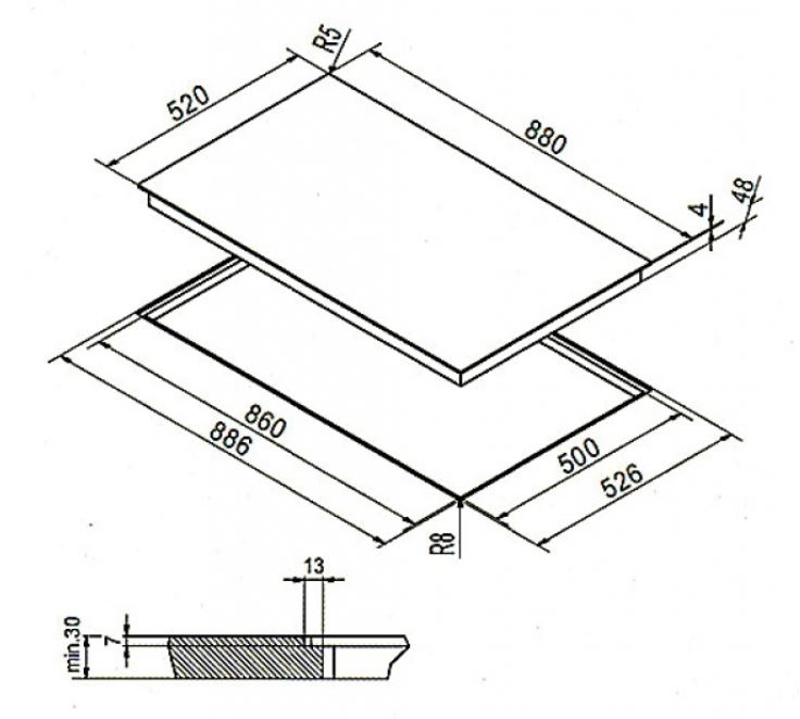 • Ausschnittmaße aufliegend: 860 mm x 500 mm