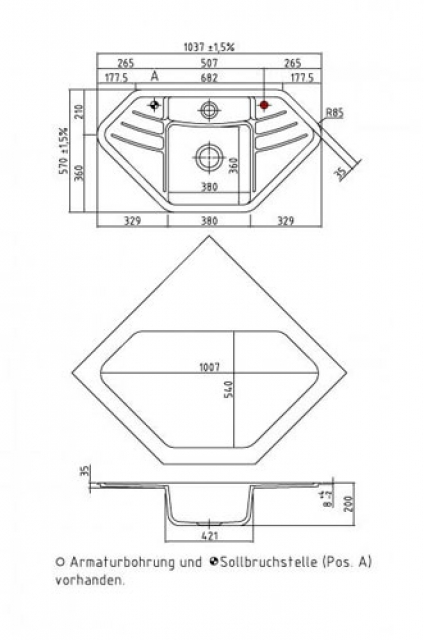 • Der Auslieferungszustand der Spüle beinhaltet eine Lochbohrung für die Armatur. Die zusätzliche(n) Lochbohrung(en) sind vorgestanzt (serienmäßige Vorbohrung); die Oberseite der Spüle ist verschlossen und muß vor Ort an den gekennzeichneten Stellen durchstoßen werden. Soll dies werksseitig vom Hersteller vorgenommen werden, wird dafür 13,-- Euro pro Spüle berechnet