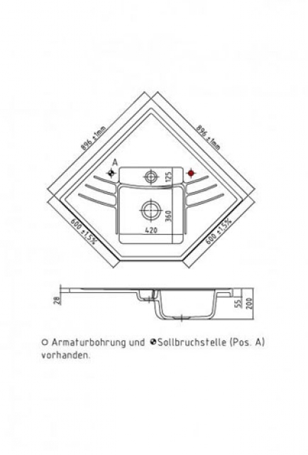• Der Auslieferungszustand der Spüle beinhaltet eine Lochbohrung für die Armatur. Die zusätzliche(n) Lochbohrung(en) sind vorgestanzt (serienmäßige Vorbohrung); die Oberseite der Spüle ist verschlossen und muß vor Ort an den gekennzeichneten Stellen durchstoßen werden. Soll dies werksseitig vom Hersteller vorgenommen werden, wird dafür 13,-- Euro pro Spüle berechnet