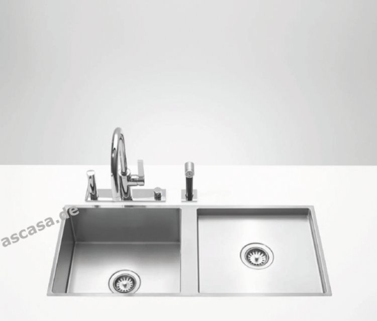 Die Dornbracht-Spüle besitzt keine Hahnlochbank, was den Vorteil bietet, die Armaturumgebung individuell zu gestalten. Außerdem ist das Doppel-Spülbecken von Dornbracht reversibelreversibel heißt: die Spüle läßt sich sowohl links als auch rechts herum einbauen; d. h. Sie können selbst entscheiden, ob Sie das Abtropfbecken auf der rechten oder auf der linken Seite haben möchten.