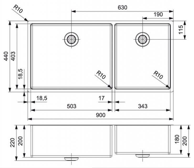 Abmessung der Spüle: 503 x 403 / 343 x 403 mm