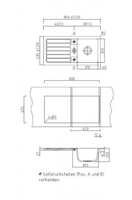 • Der Auslieferungszustand der Spüle ist inklusive vorgestanzter Lochbohrungen (serienmäßige Vorbohrung); die Oberseite der Spüle ist verschlossen und muß vor Ort an den gekennzeichneten Stellen durchstoßen werden. Soll dies werksseitig vom Hersteller vorgenommen werden, wird dafür 13,-- Euro pro Spüle berechnet