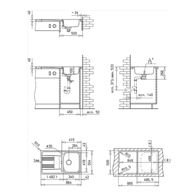 - Materialstärke des Spülenrandes 1,00 mm