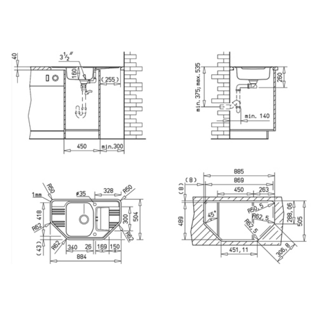 Arbeitsplattenausschnitt der COSMOS 45 EF-CN Spüle