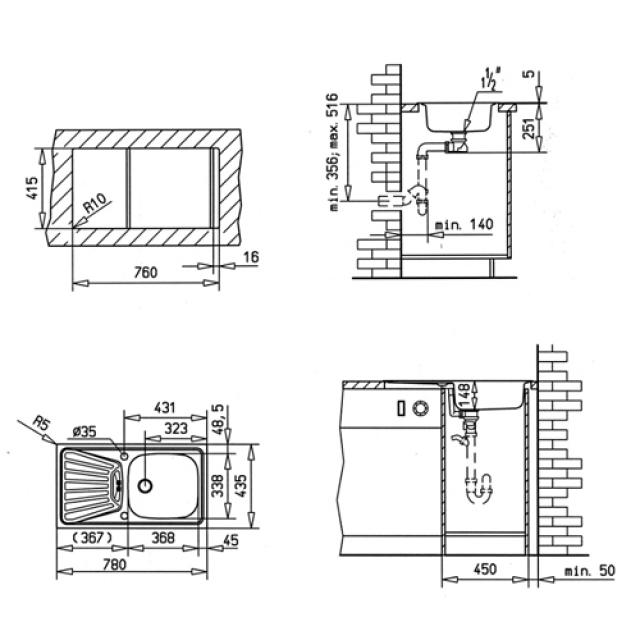 Arbeitsplattenausschnitt der DEVA 1B 1D Spüle