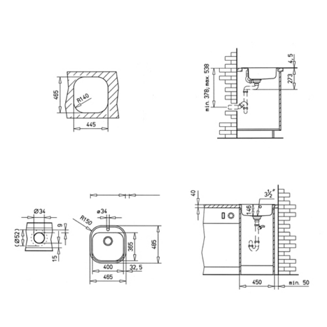 Arbeitsplattenausschnitt der STYLO 1B Spüle
