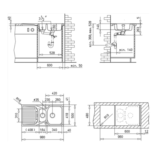 reversibel heißt: die Spüle läßt sich sowohl links als auch rechts herum einbauen; d. h. Sie können selbst entscheiden, ob Sie das Abtropfbecken auf der rechten oder auf der linken Seite haben möchten.