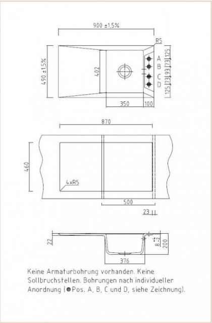 - Der Auslieferungszustand der Spüle ist inklusive vorgestanzter Lochbohrungen (serienmäßige Vorbohrung); die Oberseite der Spüle ist verschlossen und muß vor Ort an den gekennzeichneten Stellen durchstoßen werden. Soll dies werksseitig vom Hersteller vorgenommen werden, wird dafür 13,-- Euro pro Spüle berechnet