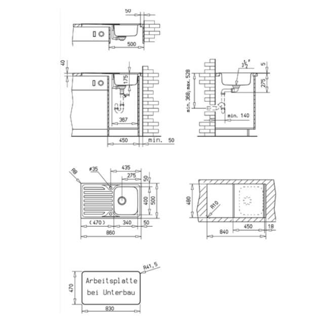 Arbeitsplattenausschnitt der CLASSIC 1B-S 1D Spüle