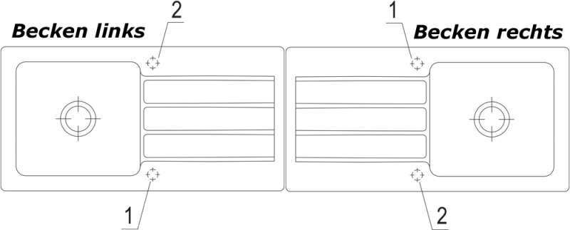 Option "Lochbohrungen durch Hersteller": Wenn Sie wünschen, dass aus Sicherheitsgründen die Lochbohrungen werksseitig vom Hersteller vorgenommen werden sollen, wählen Sie bitte diese Option. Hierfür benötigen wir von Ihnen die Nummern/Positionen des Hahnlochs/der Hahnlöcher, die V & B für Sie durchbohren soll. Bei der Spülenversion mit Handbetätigung benötigen Sie 1 Hahnlochbohrung für die Armatur, bei der Version mit Excenterbetätigung benötigen Sie 2 Lochbohrungen (Armatur und Excenter-Bedienung). Bitte beachten Sie hierzu die unten abgebildeten Maßzeichnungen, da die Positionen der Lochbohrungen bei reversiblen Spülen für die Becken-links und Becken-rechts-Versionen unterschiedlich sein können.