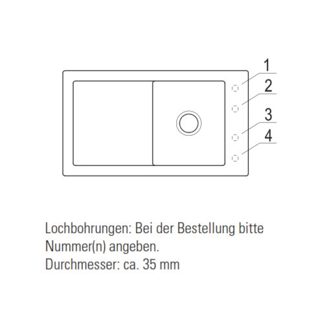 Option "Lochbohrungen durch Hersteller": Wenn Sie wünschen, dass aus Sicherheitsgründen die Lochbohrungen werksseitig vom Hersteller vorgenommen werden sollen, wählen Sie bitte diese Option. Hierfür benötigen wir von Ihnen die Nummern/Positionen des Hahnlochs/der Hahnlöcher, die V & B für Sie durchbohren soll. Bei der Spülenversion mit Handbetätigung benötigen Sie 1 Hahnlochbohrung für die Armatur, bei der Version mit Excenterbetätigung benötigen Sie 2 Lochbohrungen (Armatur und Excenter-Bedienung). Bitte beachten Sie hierzu die unten abgebildeten Maßzeichnungen, da die Positionen der Lochbohrungen bei reversiblen Spülen für die Becken-links und Becken-rechts-Versionen unterschiedlich sein können. Eine eventuelle 3. Lochbohrung für einen Seifenspender kann selbstverständlich zusätzlich gewählt werden.