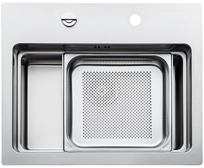 Das Füllen und Ablaufen der Spüle wird über einen runden Drehknebel auf der Oberseite der Spüle vorgenommen. Dieser Knebel, Excenterbetätigung genannt, verschließt oder öffnet den Ablauf der Spüle, je nachdem in welche Richtung er gedreht wird. Der Griff in das Spülwasser entfällt somit.