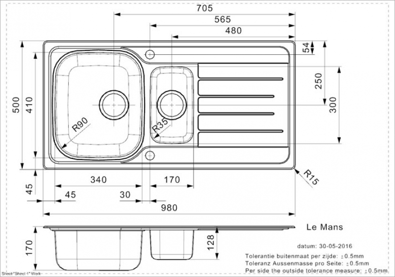 • Abmessung der Spüle: 340 x 410 / 170 x 300 mm