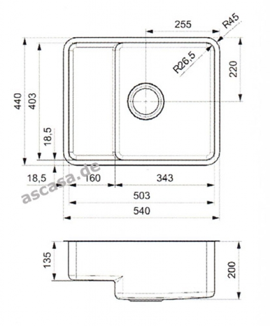 Abmessung der Spüle: 160 x 403 mm, 343 x 403 mm, Tiefe der Spüle: 200 mm