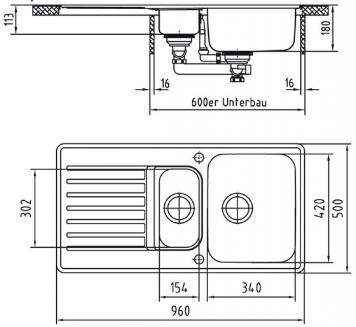 • Einbauspüle für 60 cm-Unterschrank, reversibel